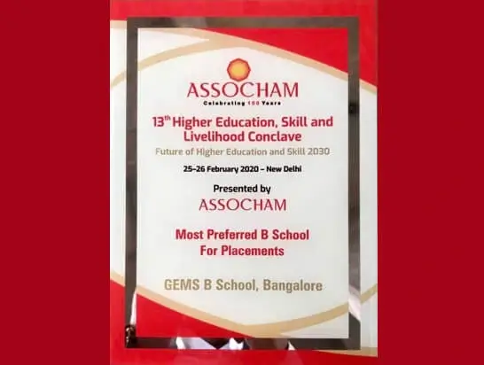 GEMS B SCHOOL received the prestigious ASSOCHAM award for the ‘Most Preferred B School for Placements’ nationally, at the ASSOCHAM 13th Higher Education, Skill and Livelihood Conclave conducted on 25th and 26th Feb 2020 in New Delhi. The award was received from one of India’s tallest Business Leaders, Dr. Niranjan Hiranandani, the Founder and Managing Director of the Hiranandani Group.