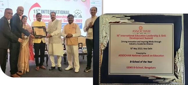GEMS B SCHOOL was recognised as the ‘B School of the year’ at the ASSOCHAM 15th International Education Leadership & Skill Development Summit held on the 13th of May 2022 in New Delhi. This Coveted ‘B-School of the year’ award of ASSOCHAM was received by us from the Honourable Minister of State for Defence and Tourism, Govt. of India, Shri. Ajay Bhatt.