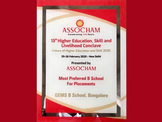 GEMS B SCHOOL received the prestigious ASSOCHAM award for the ‘Most Preferred B School for Placements’ nationally, at the ASSOCHAM 13th Higher Education, Skill and Livelihood Conclave conducted on 25th and 26th Feb 2020 in New Delhi. The award was received from one of India’s tallest Business Leaders, Dr. Niranjan Hiranandani, the Founder and Managing Director of the Hiranandani Group.