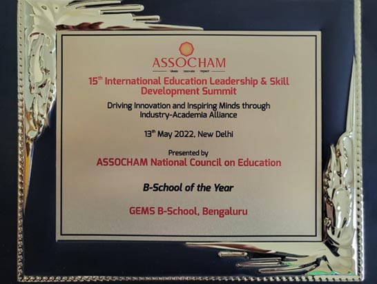 GEMS B SCHOOL was recognised as the ‘B School of the year’ at the ASSOCHAM 15th International Education Leadership & Skill Development Summit held on the 13th of May 2022 in New Delhi. This Coveted ‘B-School of the year’ award of ASSOCHAM was received by us from the Honorable Minister of State for Defense and Tourism, Govt. of India, Shri. Ajay Bhatt.